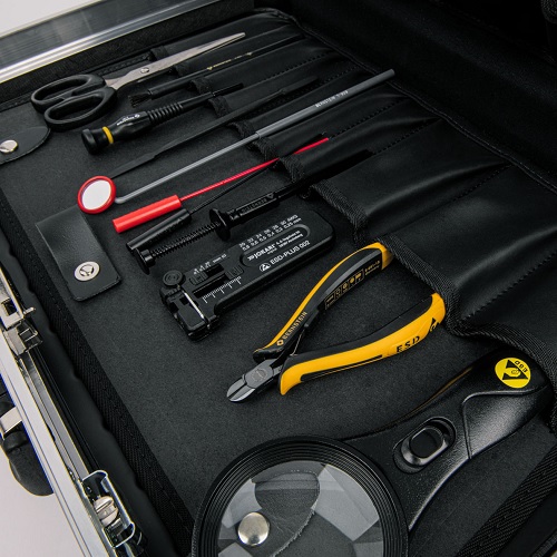Muhafaza kabukları, alet tablaları ve değişken olarak bölünmüş alt tepsi enerji tüketen malzemeden yapılmıştır ve DIN EN IEC Standardı 10 00 15 Bölüm 5'e uygundur. Aletler, DIN EN 61340-5-1'e uygun olarak çeşitli test laboratuvarları tarafından başarıyla test edilmiştir. , 61340-2-1 ve 61340-2-3, ESD korumalı alanlarda çalışmak için. Sağlam kasa kabukları sağlam bir çift alüminyum çerçeve ile preslenmiştir. Biri her iki tarafa da takılabilen iki panelde, takılabilir bölmelerde 32 alet kullanıma hazır şekilde saklanır. Kasanın kapağında yazılı belgelerin saklanması için bir belge bölmesi bulunur. Çantanın alt kısmındaki serbestçe bölünebilen tepsi, ilave alet ve aletlerin saklanmasına olanak tanır. Kasanın 2 kilidi ve bir şifreli kilidi vardır.