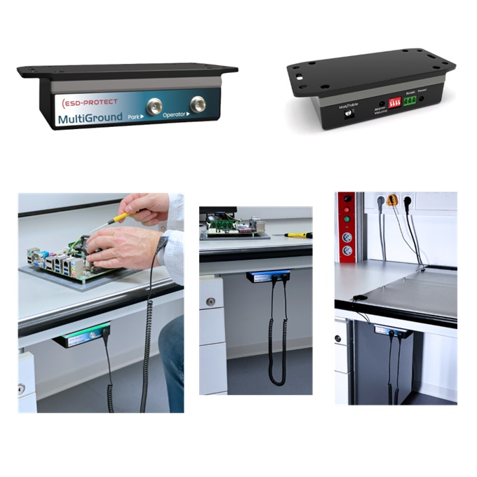 ESD-PROTECT'in yeni MultiGround Monitörü, iki temel işlevi tek bir cihazda bir araya getiriyor: Bilek kayışı aracılığıyla personelin topraklanmasını sağlamanın yanı sıra, hassas kontrol ölçümleri aracılığıyla kişinin ve çalışma yüzeyinin kalıcı topraklamasını sürekli ve güvenilir bir şekilde izliyor.